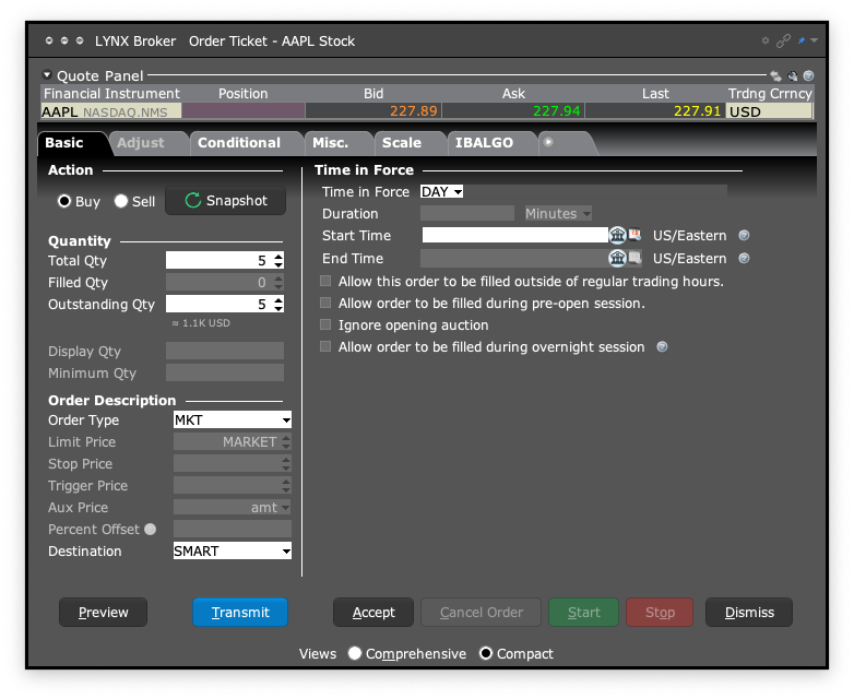 In the bottom left of the order ticket window, click Preview to review the order details. Then click Transmit to submit or Close to exit without submitting.
